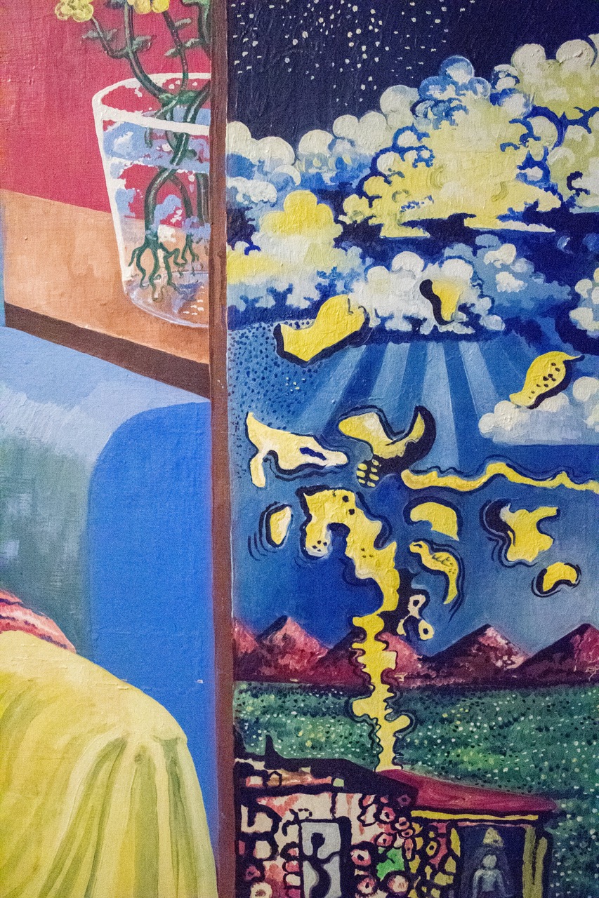 In the Earthly Worlds painting the woman represents the planet, Mother Earth, and what we have that we can lose. She’s pregnant with a small embryo illustrated with white coloring. The painting represents the future. The woman is also clutching the cloth, which represents the pain of what’s coming. The apple she’s holding is symbolic of the story of Adam and Eve. All sins started when Adam ate the apple.